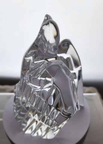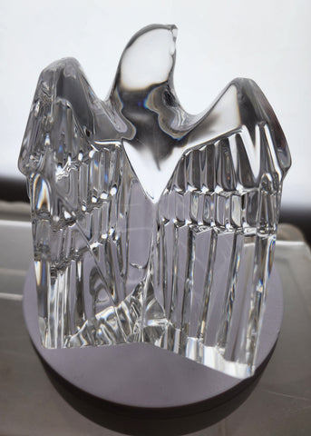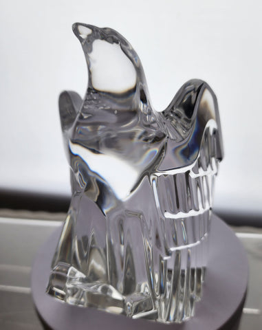 4.5" high, The Steuben Glass Eagle is a handcrafted piece of art that showcases exquisite design and impeccable craftsmanship. Made by skilled artisans, the eagle figurine represents strength, grace, and resilience. The perfect addition to any home or office, this magnificent piece is a symbol of American heritage and a timeless treasure for any collector.